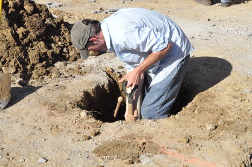 Work began by digging around the sewer and supply lines down to a fitting that needed to be removed, and it was slow going because of all the rocks.