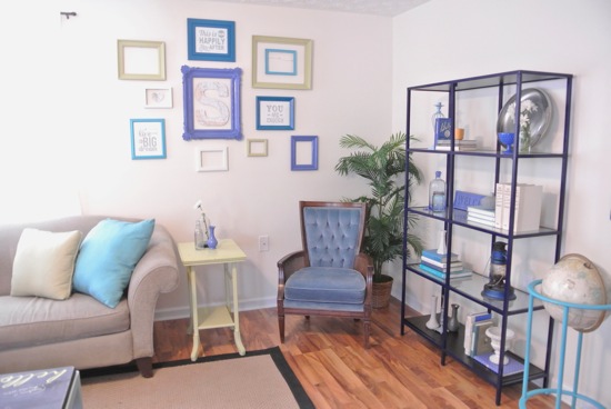 Here was my favorite little corner. I bought this chair for $20 – more than I would have liked, but I loved it so much, I couldn’t walk away. And the shelves were generously donated by Rustoleum, but decorated by the fabulous Brooke from All Things Thrifty.