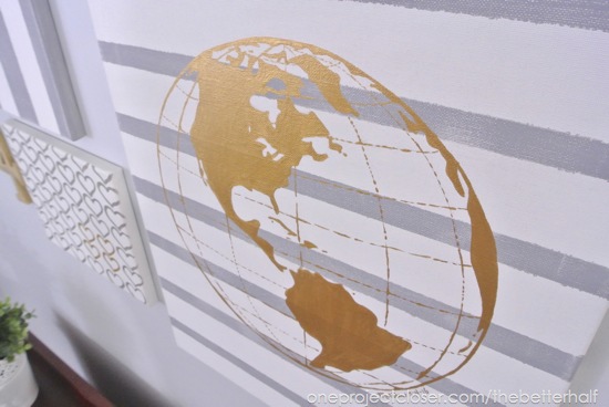 The globe was the most work of all the pieces. I traced a print-out onto the canvas using carbon paper, then painted the gold. It took hours!! Fortunately, I had this season of Downton Abbey to watch on the computer, so I was happy.