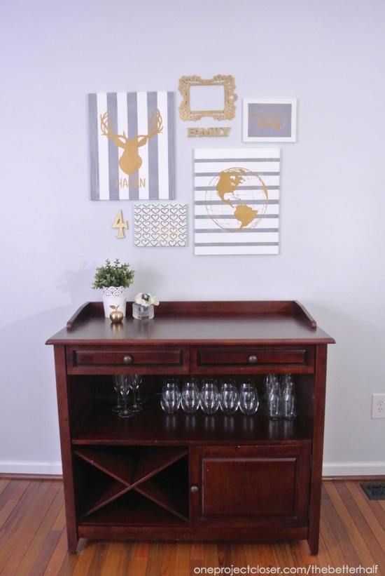My gold and gray gallery wall was completed last January and is still one of my favorite spots in the house. I love that even though it was a winter project, it still looks fresh and fun, while costing very little!