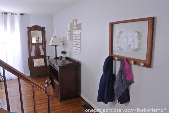 When you walk in our front door and look to the right, this is the view. On the left side of the door is the dining room and a small hallway and stairwell divide the two. At the bottom of the stairs is my painted antique window with glass knobs we use for coats.