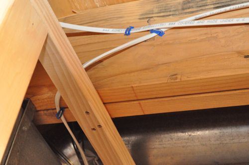 Next, Russel runs 14/2 cable leaving a generous amount of excess for wiring the lights. Whenever possible, Russel runs the cables parallel to the joists and often uses concealed space within a bulkhead to traverse perpendicular to the joists. He secures the cable with an insulated staple every 4′ and within 8″ of the switch box and fixture. He also runs a wire from the circuit breaker panel to the switch.