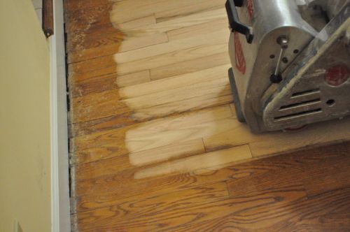 The belt sander can only get so close to walls, corners and other tight spaces. The guys were very careful not to bump the sander and thereby damage the floor. They also avoided going over the floor vent openings with the drum sander.