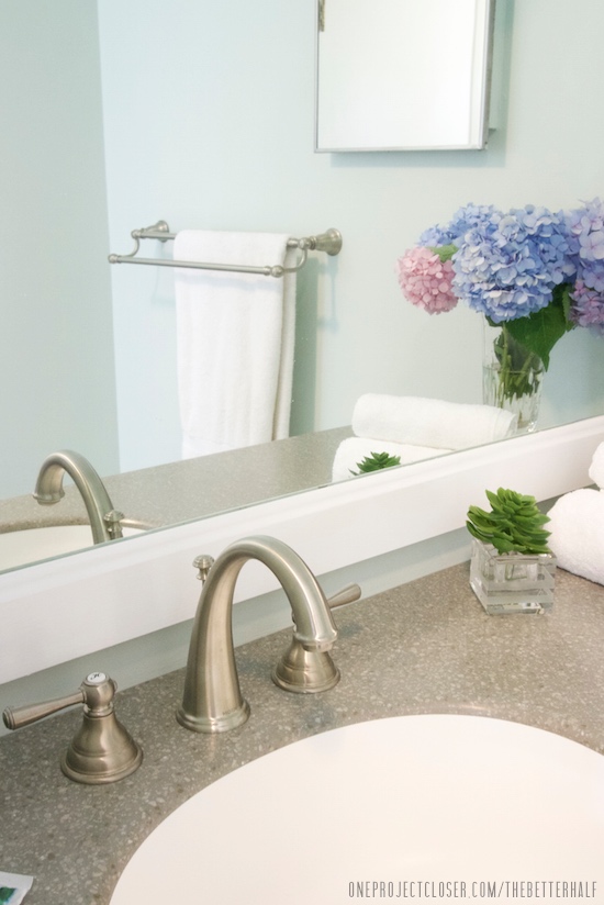 The final touch our master bath remodel was our mirror. The original was a basic mirror that went wall to wall, and while functional are eroded on the back and with the taller cabinet bumped into the base of the beautiful new light fixture. So my dad came over with a glass cutting tool and cut off about 6 inches from the top. Then, Ethan framed it out with some trim and glued it to the mirror. A big thanks to The DIY Village for their tips on framing a bathroom mirror.