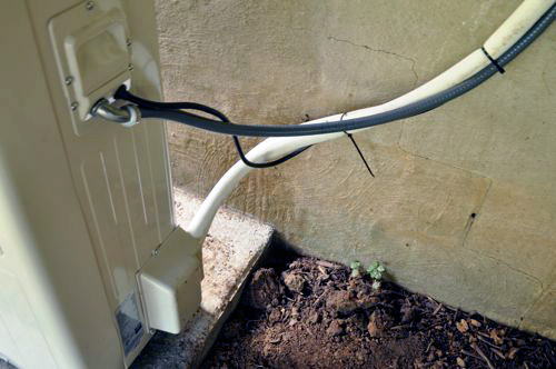 Here you can see the drain and the flexible copper freon lines and the electric supply running from the compressor.