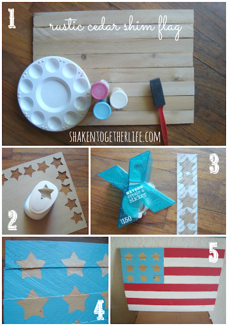 With Memorial Day under our belt and the weather heating up in Florida, I am ready to put away the Spring pastels and haul out the bright colors of summer! Since red is my favorite color, decorating in red, white and blue is only natural. I tend to lean towards rustic and funky in our dining room – think vintage soda crates, chippy birds, metal tea kettles and old fabric lanterns! So today, I thought I would share an easy project that fits right into my quirky decor and starts with inexpensive materials you can find in your local home improvement store … check out this cool rustic cedar shim flag!