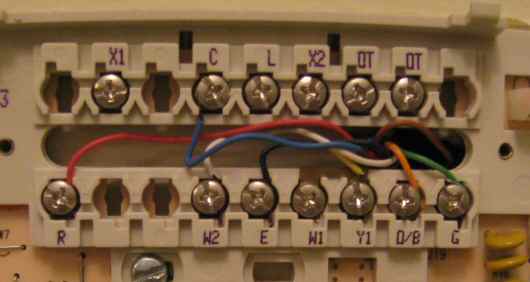 Reader question: I just picked up a new Trane programmable thermostat for our air conditioner/heat pump system. When I took the front off the current honeywell thermostat, it looks like there are quite a few more wires than what the new thermostat will accept. The thermostat has seven wires connected to terminals labeled C, R, W2, E, Y1 and W1 together (with a jumper), O/B, and G. There’s also a tan wire that’s not connected to anything. (I’ve attached a picture). The new thermostat only has RC, R, O, Y, G, B, S1, and S2. Based on the instructions, it looks like I can match up C, R, O, Y, and G, but that would leave me with no place to connect the wires that are currently connected to E and W2, unless I connected them to S1/S2, which doesn’t seem right – the instructions say this is for an outside sensor. Do I need a different thermostat? – Rick