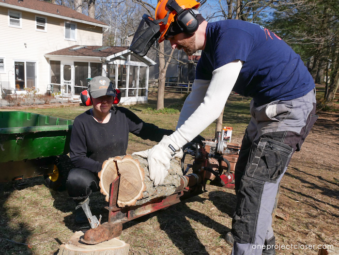 Once the tree trunk was cut up, we split the logs using the log splitter from my grandfather. Cue all the feels! My grandfather, Grandaddy Bob, was a college science professor but in his retirement, he became a contractor and built homes. He loved working hard and had soooo many tools and useful equipment. After he died about 12 years ago, the log splitter came to be shared by my siblings and travels to where ever he is needed. I’m not being sexist, a log splitter is obviously a boy. LOL